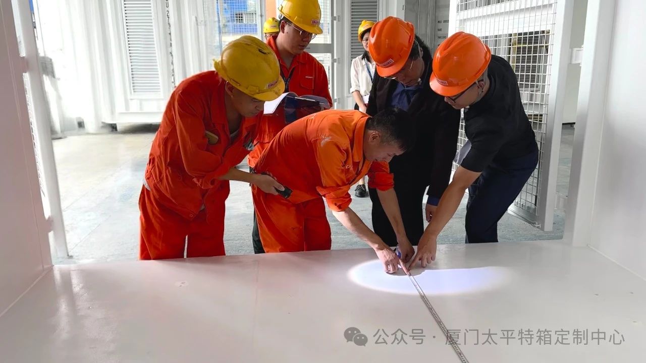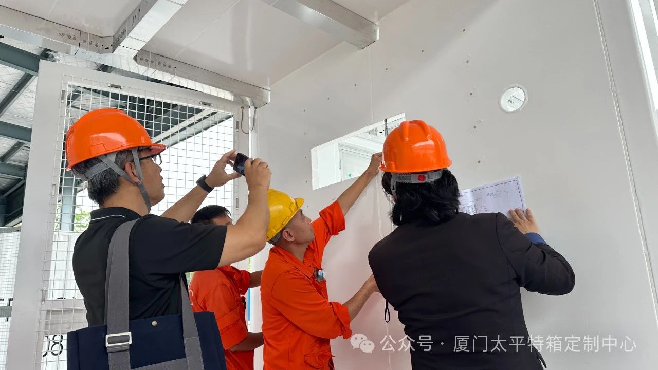 在驗收現場,客戶代表對我司產品進行了全面細致的檢查,從外觀美觀度、箱體材質及焊接工藝、機柜設備安裝預制位到防腐防水等多項產品功能逐一核驗。廈門太平以專業的研發設計、行業一流的生產工藝、嚴格的全流程質量把控和高效的團隊協作,贏得了客戶的高度贊譽。